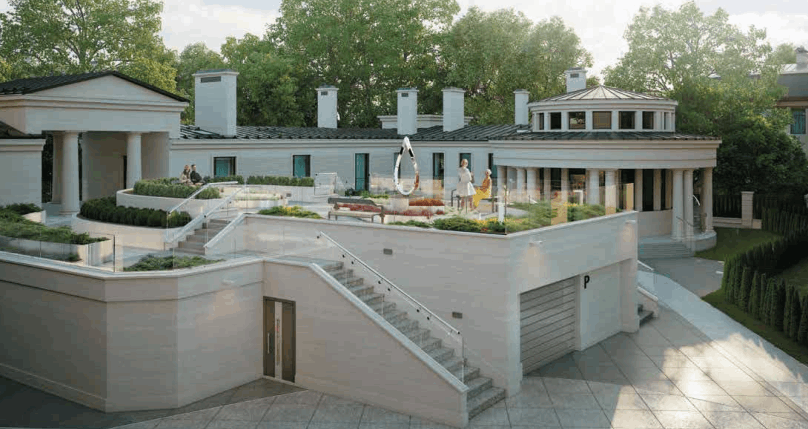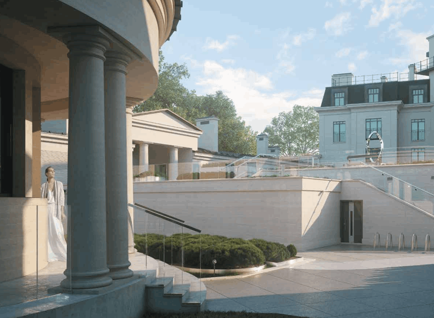 - Собственная инфраструктура, закрытая для посторонних: переговорная, комната для личных водителей и охранников, сауна, хаммам, комната для медитации, массажный кабинет и тренажёрный зал.